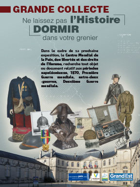 Dans le cadre de sa prochaine exposition, le Centre Mondial de la Paix, des libertés et des droits de l’Homme, recherche tout objet ou document relatif aux périodes napoléonienne, 1870, Première Guerre mondiale, entre-deux-guerres, Deuxième Guerre mondiale.